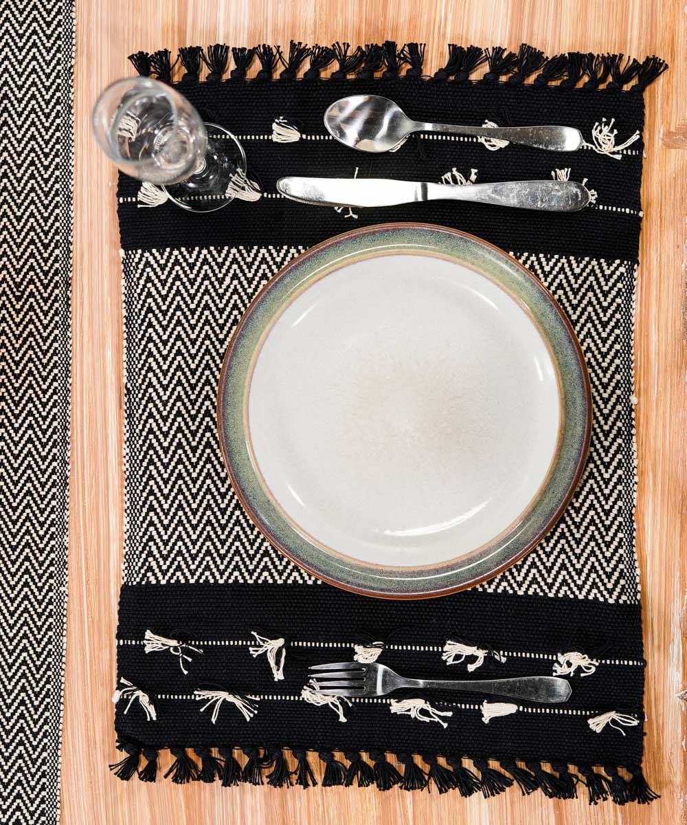 Elevate your space with our placemat in woven dobby design featuring chevrons and tassels. Colour: Multi Fabric:...