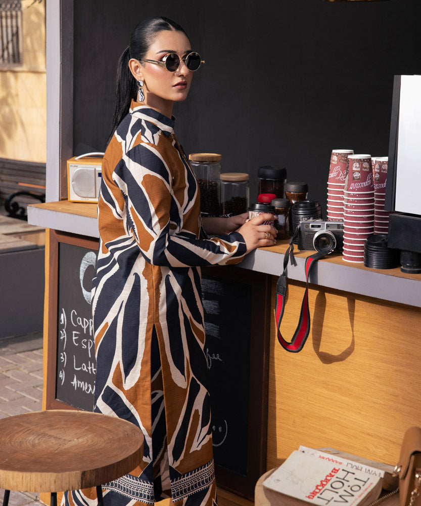 For a stellar statement this fall, adorn our mustard and blue shirt piece accented with artistic brush...
