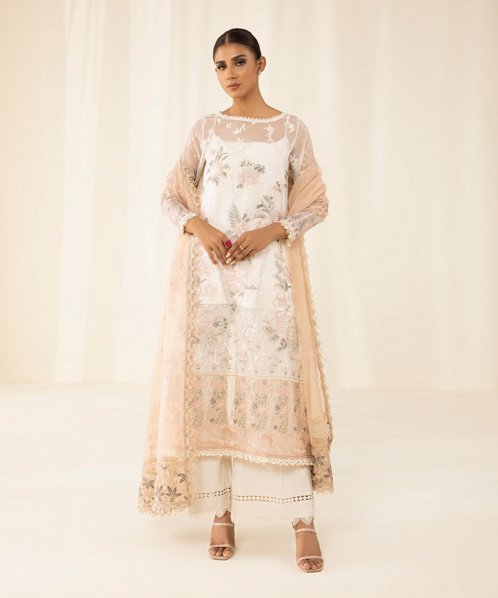 Our off white organza three-piece is adorned with intricate sequin detailing and floral embroidery patterns, paired with...