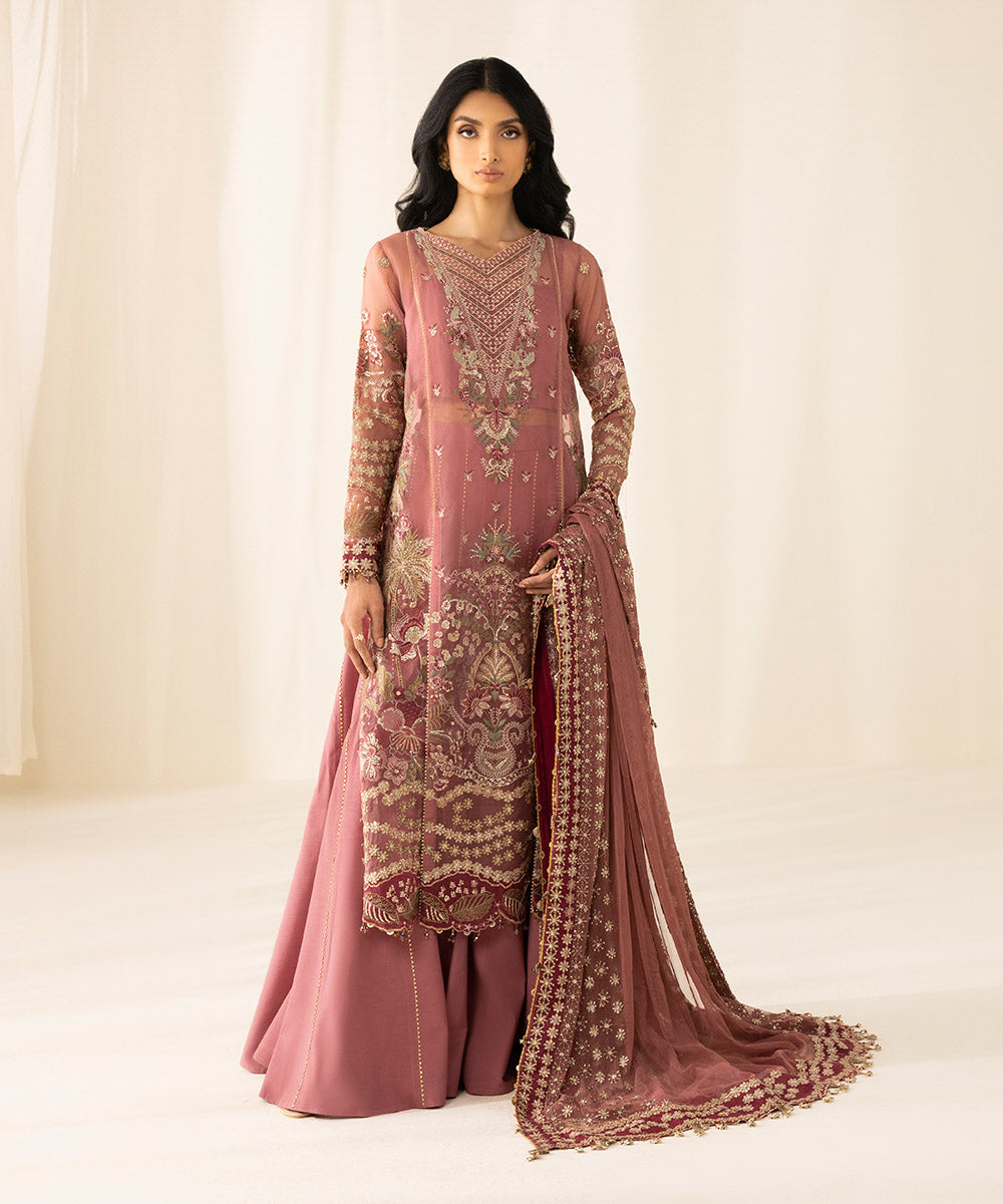Dazzle away in our blush pink three-piece organza silhouette accented with intricate embroidery patterns and sequin detailing...