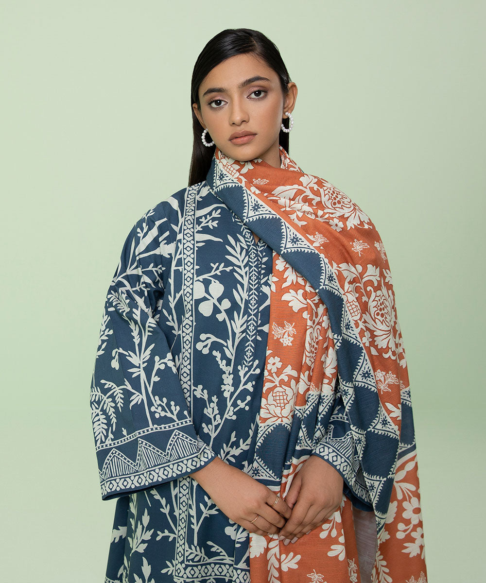Embrace the spirit of fall with our blue three-piece accented with intricate patterns paired with an orange...