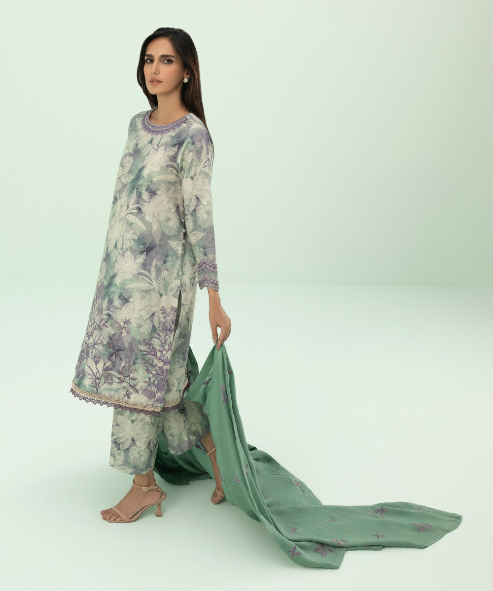 Our sage green three-piece features abstract brush strokes and floral patterns and is paired with a poly...