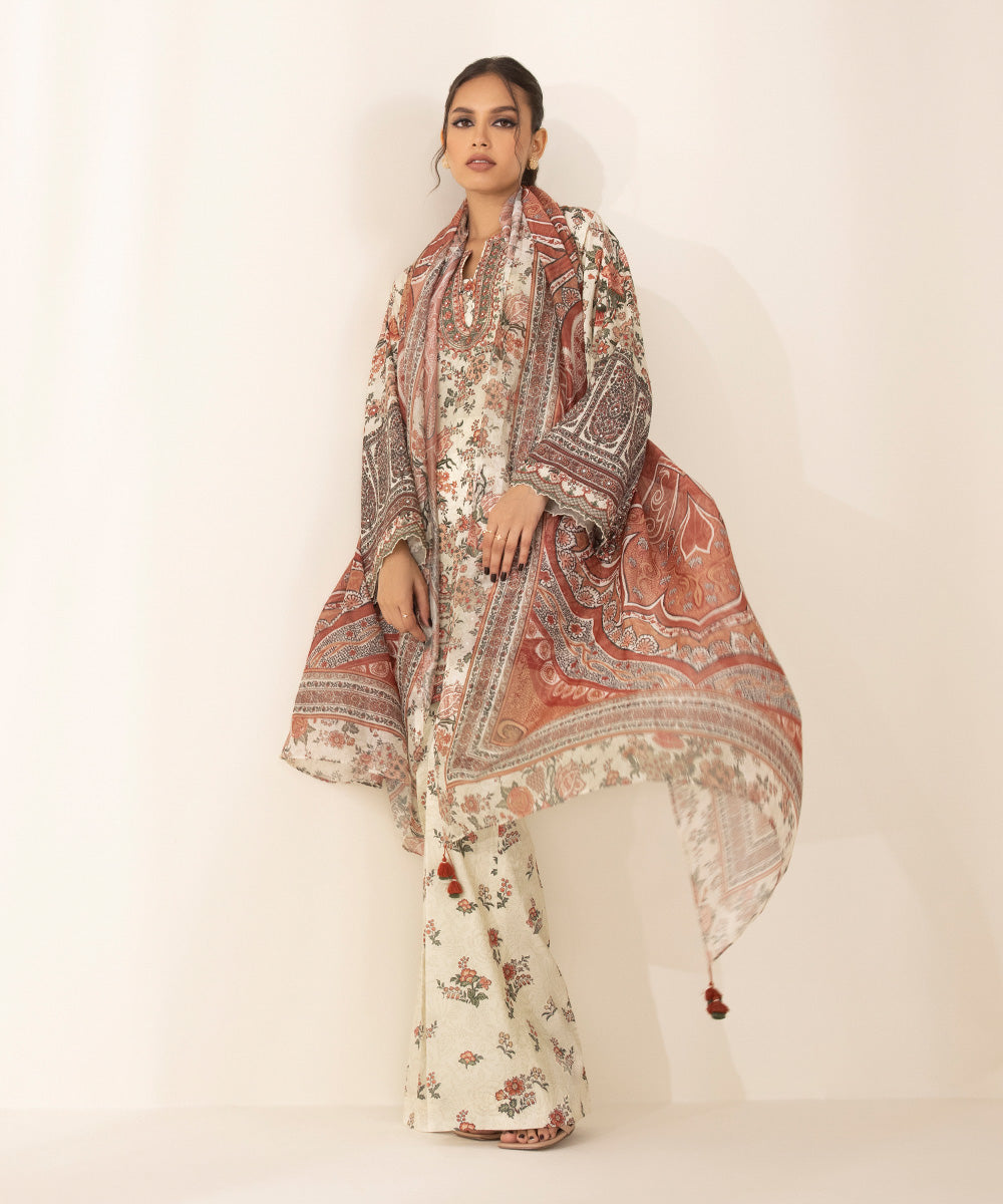 Channel your inner vintage icon with our off white three-piece ensemble featuring a tissue dupatta accented with...